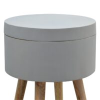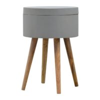 This round table and drawer unit is perfect for the side of the bed or sofa. It contains one deep drawer, providing ample storage space for any bits and pieces you wish to have close to you. It has been painted in a grey paint and features 4 Nordic style legs in an oak-ish finish.
