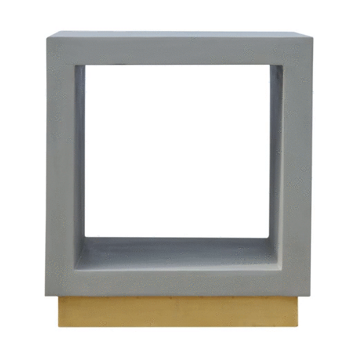 This cut out end table piece has been constructed from 100% mango wood in a cement finish. It features a golden base which compliments the piece perfectly. It can stand alone as an accent piece in the home or be partnered with the other cement pieces from the range.