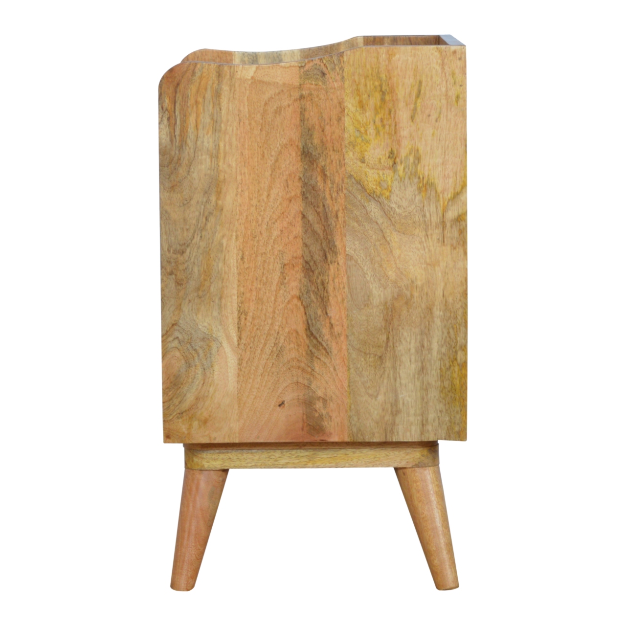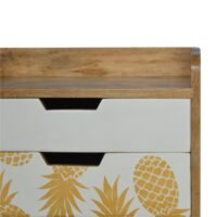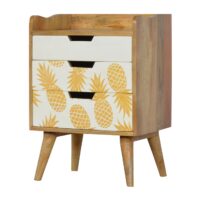 This bedside table is the perfect stand for any bits and pieces you wish to keep nearby before bedtime. It features ample space for a lamp, photo frame or any ornaments. It has been constructed from 100% solid mango wood with a fine oak-ish finish body with 1 white hand painted drawer and 2 pineapple screen printed cut-out drawers. Some other product characteristics are 4 Nordic style legs with cut out slots for easy access to and from the drawers. A unique design and lovely addition to the home.