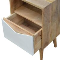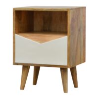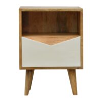 This petite hand-painted bedside offers both style and storage space with its minimalist yet stylish design. It has been constructed from 100% solid mango wood in an oak-ish finish and features one put-out drawer with a white envelope style drawer front. The open slot allows you to discreetly store any smaller bits and the top allows space to store any lamps, ornaments or plants. It stands on 4 Nordic style feet and is the perfect addition for the bedroom