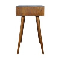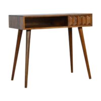 This solid wood writing desk has been finished in a chestnut finish and provides ample space for you to work on. The main feature of the piece is the hand-carved raised pyramid design on the drawer front, it also includes 1 open slot for storing any books, paper, or stationary. It is the perfect addition to any home, with its clean design to suit most interiors.