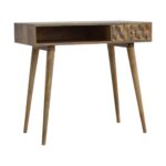 The main feature of this writing desk is the carved cube drawer front which makes the pieces from this collection stand out. It has been constructed from 100% solid mango wood in an oak-ish finish, features 1 open slot for extra storage, and stands on 4 Nordic-style legs. It can be partnered with the other pieces from the range or stand individually as its style is versatile and can fit into different types of interiors.