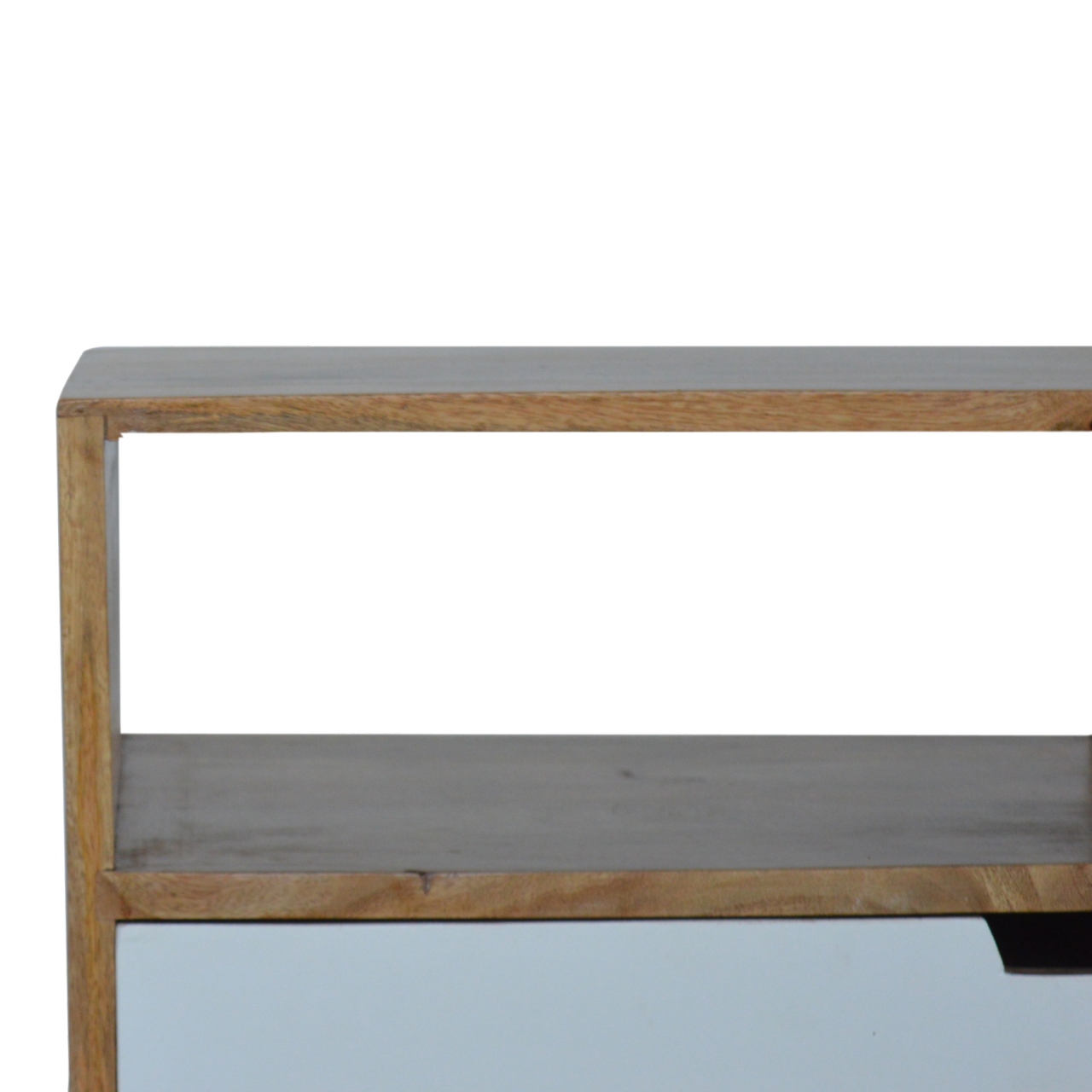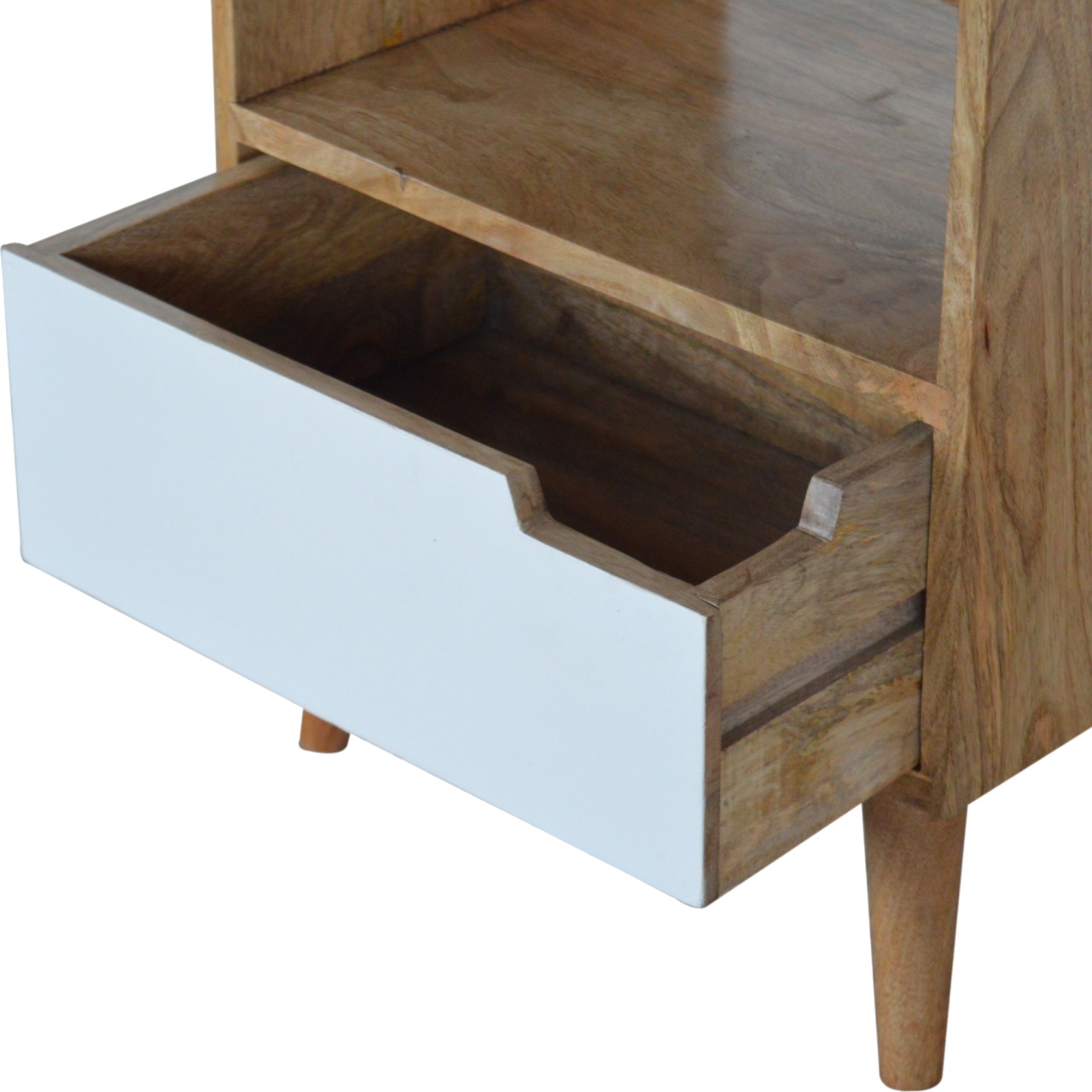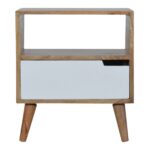 This bedside offers both style and storage space with its simple yet stylish design. It has been constructed from 100% solid mango wood in an oak-ish finish and features one white hand painted drawer. It has a small slot that can be used for opening and closing the drawer and it stands on 4 Nordic style feet making it the perfect addition for the bedroom