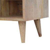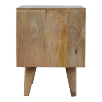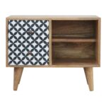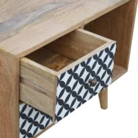 A practical and stylish addition to the home, this District Diamond screen printed mini cabinet can be used anywhere in the home from the hallway, bedroom or living room. Constructed from 100% solid mango wood in an oak-ish finish and 4 Nordic style legs, this piece offers storage space with 2 open slots and 2 drawers that each have a shiny knob.