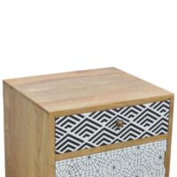 A practical and stylish addition to the bedroom, this bedside features 2 different mixed pattern screen printed designs which contrast well with the oak-ish finish of the piece, it can be used alone or as a pair on either side of the bed. Constructed from 100% solid mango wood and 4 Nordic style legs, this piece provide offers storage space with 1 drawer and 1 door.