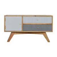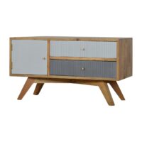This divine media unit has been constructed from 100% solid mango wood with an oak-ish finish body and grey painted drawer fronts which include candle knobs for easy access to and from the drawers. This modern and simple piece would compliment any living room and is ideal for compact city homes.