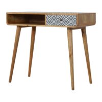 This beautiful and unique writing desk has been constructed from 100% solid mango wood in a fine oak-ish finish with a curved bottom design. The main feature of this piece is the monochrome screen printed drawer front which provides a lovely contrast between the print and the wood. Some other features include 4 Nordic style legs and one open slot for storing any bits and pieces great for studying.