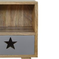 This modern little bedside is the perfect quirky addition to the bedroom. Constructed from 100% solid mango wood in an oak-ish finish it features a spacious open slot and a 1 grey painted drawer featuring a star cut out for easy access in to and from the drawer and useful for storing any small belongings before bedtime.