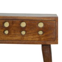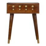 This bedside has been constructed from 100% solid mango wood and features 1 small drawer for bedtime storage which features a hole cut out design with a brass inlay complimenting the chestnut finish wood body perfectly. It stands on 4 Nordic style legs which each have a brass gold tip. This bedside can be partnered with the media unit or stand alone as an accent piece in the bedroom.