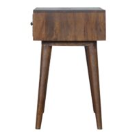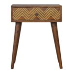This bedside is endlessly versatile and will prove handy all over your home. It has been constructed from 100% solid mango wood in a beautiful chestnut finish. The main feature of this design is the brass inlay chevron pattern drawer complimenting the darker wood finish nicely. Some other features are the 4 Nordic style legs and 1 drawer for storing away any bits and pieces before bedtime. The perfect addition to the home.