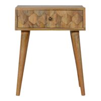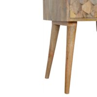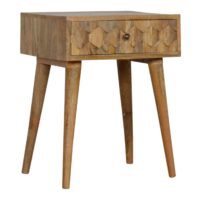 Enjoy the minimalist design of this bedside, constructed from 100% solid mango wood in an oak-ish finish with beautiful pineapple hand carved design on the drawers. It features 4 Nordic style legs and one drawer to take care of everyday utility items. This bedside table will add a definite and lasting character to your bedroom.