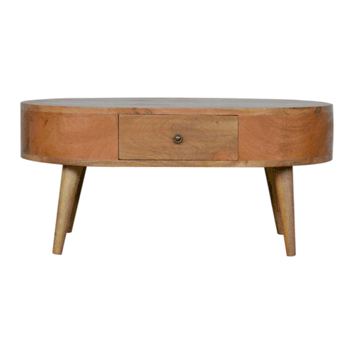 This solid wood coffee table has been constructed from 100% solid mango wood in an oak-ish finish and offers a unique shaped design with rounded edges. It features one drawer with a shiny brass knob and Nordic style legs. A great simple and addition to the home.