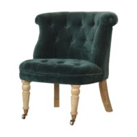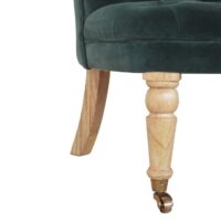 This petite accent chair is beautifully hand carved from 100% solid mango wood and upholstered in a beautiful emerald green cotton velvet. Other features include deep button tufts, 2 caster legs at the front and 2 tapered legs at the back. All 4 legs have a fine oak-ish finish. Perfect to add some extra character and definition to the home.