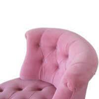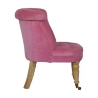 This petite accent chair is beautifully hand carved from 100% solid mango wood and upholstered in a beautiful pink cotton velvet. Other features include deep button tufts, 2 caster legs at the front and 2 tapered legs at the back. All 4 legs have a fine oak-ish finish. Perfect to add some extra character and definition to the home.