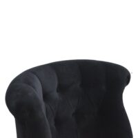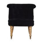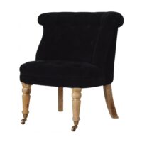 This petite accent chair is beautifully hand carved from 100% solid mango wood and upholstered in a beautiful black cotton velvet. Other features include deep button tufts, 2 caster legs at the front and 2 tapered legs at the back. All 4 legs have a fine oak-ish finish. Perfect to add some extra character and definition to the home.