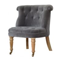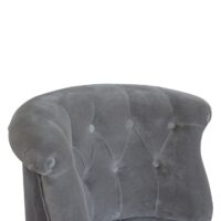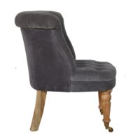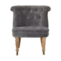 This petite accent chair is beautifully hand carved from 100% solid mango wood and upholstered in beautiful grey cotton velvet. Other features include deep button tufts, 2 caster legs at the front, and 2 tapered legs at the back. All 4 legs have a fine oak-ish finish. Perfect to add some extra character and definition to the home.