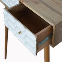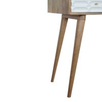 This beautiful console table has been constructed from 100% solid mango wood in an oak-ish finish with unique white capsule style hand carved drawer fronts that have been hand painted white. It features 4 Nordic style legs and two deep drawers to take care of everyday utility items. This console table will prove handy in your living room or hallway.
