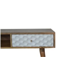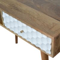 This stunning writing desk has been constructed from 100% solid mango wood in an oak-ish finish with unique white honeycomb hand carved drawer fronts. It features 4 Nordic style legs, 1 open slot, and 1 white hand painted drawer perfect for studying or writing.