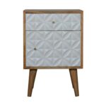 This stunning diamond hand carved bedside table will add a stylish and contemporary vibe to your home. Constructed from 100% solid mango wood in an oak-ish finish it features 2 white hand painted drawer fronts and stands on 4 Nordic style legs, a great statement piece for the bedroom.