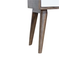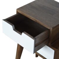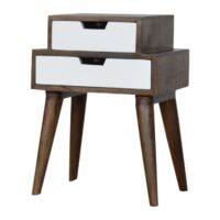 This bedside table is the perfect stand for any bits and pieces you wish to keep nearby before bedtime. It features ample space for a lamp, photo frame or any ornaments. It has been constructed from 100% solid mango wood with a rich walnut finish body and 2 different sized, white hand painted cut-out drawers. Some other product features are 4 Nordic style legs with cut out slots for easy access to and from the drawers. A lovely addition to the home.