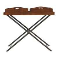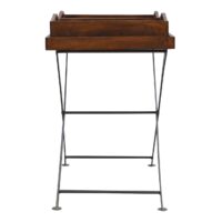 Add this versatile piece to your kitchen which offers ample space with 2 wooden trays for plates, cutlery and food you may want to chop up and prepare. It has been constructed from 100% solid mango wood in a chestnut finish and features a cross metal base with 2 iron legs which makes it strong and sturdy and allows this piece to be stored away easily when not in use. The perfect addition to a cafe/restaurant or kitchen.