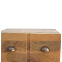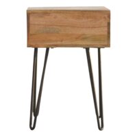 This solid wood industrial design bedside is a fabulous addition to your home adding a more modern feel your bedroom. It is constructed from 100% solid mango wood and the base/legs are constructed from 100% metal Iron. Useful storage space is available with 1 drawer and a decent sized top to place a lamp, books etc. Other features include a smooth oak-ish finish on the wood, triangular metal legs which have a pewter finish and are knock down but very easy to assemble, the drawers also come with 2 shell handles which are.