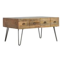 This solid wood industrial design central table is a fabulous addition to your home adding a more modern feel to your front room. It is constructed from 100% solid mango wood, and the base/legs are constructed from 100% metal Iron. Useful storage space is available with 2 drawers, a smooth oak-ish finish on the wood, triangular metal legs which have a pewter finish and shell handles.