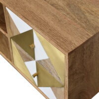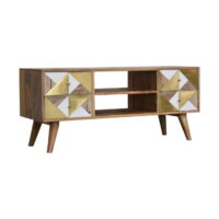 Providing an elegant touch to a living room, this 100% solid mango wood cabinet has an oak-ish finish and has been given a clear lacquer for extra durability, it features drawers that have a combination of mango wood, a real brass sheet, and acrylic (faux) marble, the 2 open shelves and drawers will hold anything such as spare cables, gaming handsets, and other techy bits and bobs. Other features include shiny brass knobs and nordic style legs.