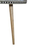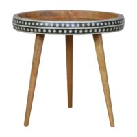 This solid wood end table has made from 100% mango wood in a fine oak-ish finish. The no-fuss finish reveals the beautiful grain of the mango wood which this piece of furniture is made of. This tripod table stands on Nordic style legs and features a black and white bone inlay pattern on the edges. The bone is sourced responsibly from deceased animals such as camels, goats, and buffaloes.