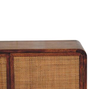 Crafted from 100% Solid Mango Wood in a rich chestnut finish, this compact cabinet combines classic form with playful charm. The dual doors feature a beautifully textured rattan in a hand-woven design that adds warmth and character, opening to reveal ample hidden storage. Rounded ball feet provide a sculptural touch while ensuring sturdy support. Whether used in a hallway, bedroom, or living area, this piece brings stylish practicality to any setting.