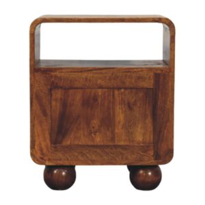 Charming and practical, this bedside table is handcrafted from 100% Solid Mango Wood in a deep chestnut finish, offering a bold yet elegant silhouette. It features an open shelf for easy access to books or essentials, along with two compact drawers adorned with intricately handwoven rattan fronts for added texture and warmth. The rounded bun feet give it a playful, vintage-inspired character. Blending function and artisanal beauty, this piece is a versatile accent that enhances bedrooms with timeless design and handcrafted appeal.