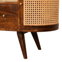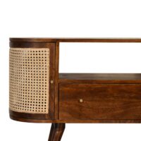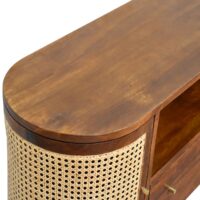 This stylish Nordic Woven Media Unit combines 2 woven cabinets with a smooth chestnut finish body and legs. Constructed from 100% solid mango legs it has a shiny brass knob on the drawer and nordic style legs. Make full use of this media unit in the living room and partner it with the rest of the collection.