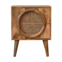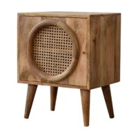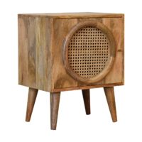 The Larissa bedside will stand out in your interior thanks to its understated look and subtle originality. The beautiful grain pattern and rattan design do not make this sideboard any less functional. In fact, it features a door with 2 drawers inside which offer plenty of storage space. It has been constructed from 100% solid mango wood in an oak-ish finish and features nordic style legs.