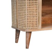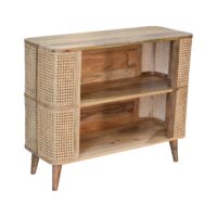 The Larissa open cabinet will stand out in your interior thanks to its understated look and subtle originality. The beautiful grain pattern and rattan design do not make this cabinet any less functional. In fact, it has two good-sized shelves and ample space on top for displaying any ornaments, flowers, or candles. It has been constructed from 100% solid mango wood in an oak-ish finish and features nordic style legs.