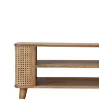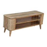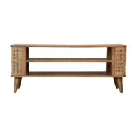 The Larissa open media unit will stand out in your interior thanks to its understated look and subtle originality. The beautiful grain pattern and rattan design are a lovely addition along with the 2 large open shelves and ample space on top for storage. Perfect for the living room. It has been constructed from 100% solid mango wood in an oak-ish finish and features nordic style legs.