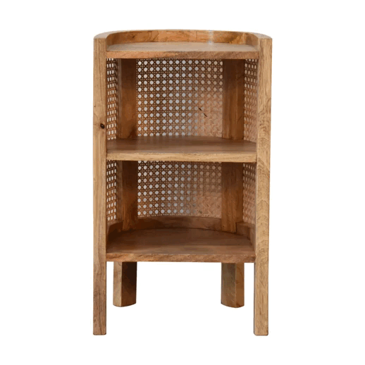 The Larissa Open mini bedside will stand out in your interior thanks to its understated look and subtle originality. The beautiful grain pattern and rattan design do not make this sideboard any less functional. In fact, it features 2 small drawers inside which offer storage space to keep things close before bedtime. It has been constructed from 100% solid mango wood in an oak-ish finish and features straight legs.