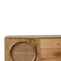 The Larissa sideboard will stand out in your interior thanks to its understated look and subtle originality. The beautiful grain pattern and rattan design do not make this sideboard any less functional. In fact, it has 3 large and drawers inside which offer plenty of storage space. Perfect piece for a hallway, kitchen or living room. It has been constructed from 100% solid mango wood in an oak-ish finish and features nordic style legs.
