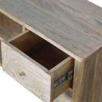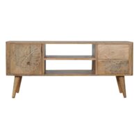 This solid timber media unit is expertly constructed from 100% solid mango wood in an oak-ish finish. It has a Leaf Embossed Resin design on both sides which also features shiny knobs, the unit also has 2 open slots. This piece will compliment your home beautifully whether it is a standalone piece or partnered with the other pieces from the range. It is carefully finished in a durable lacquer to help protect and enhance the look of this piece of furniture.