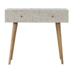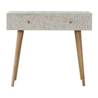 The beautiful console table has been constructed from 100% solid mango wood and features 2 spacious drawers made with a floral bone inlay which has been painted in a light taupe colour and finished with a oak-ish finish base and legs. It can be used as an accent piece in the home or be partnered with the other bone inlay pieces.