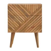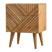 Add this unique solid wood Lille Bedside to your bedroom, constructed from 100% solid mango wood in an oak-ish finish, this piece features a very unique line hand carved design on the drawer fronts with a clean finish meaning easy access into the drawers without any knobs. It features 4 Nordic style legs which compliment the body nicely and gives the entire piece a contemporary look. The perfect addition to the home.
