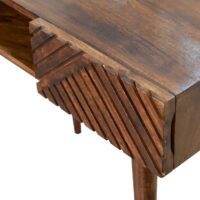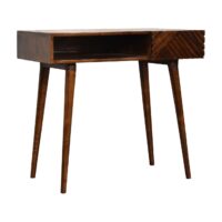 Add this solid wood Lille writing desk to your home constructed from 100% solid mango wood in a chestnut finish, this piece features 1 carved drawer and a large open slot meaning easy access. It features 4 Nordic-style legs which complement the body nicely and give the entire piece a contemporary look. The perfect addition to the home.
