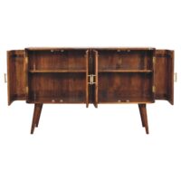 Introducing the Linden Sideboard, a stunning fusion of mid-century modern elegance and practicality. Crafted from 100% solid mango wood in a rich Chestnut finish, this piece radiates warmth and character. Its gently curved silhouette, paired with tapered Nordic-style legs, exudes timeless sophistication. Featuring two shelves in two compartments with sleek brass handles, it provides ample storage for your essentials while maintaining a clean, stylish look. Perfect for the living room, dining area, or hallway, the Linden Sideboard is a versatile and durable addition that enhances any space with its refined craftsmanship and understated charm.