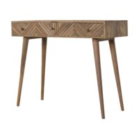 Add this beautiful dressing table to your home. Constructed from 100% solid mango wood with 3 storage drawers which offer a unique carved design, it also features a foldable mirror and mini storage compartments for storing any bits and pieces. Some other products features include Nordic style legs and shiny brass knobs. A lovely versatile piece that will compliment any room beautifully.