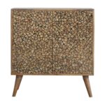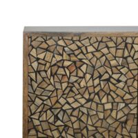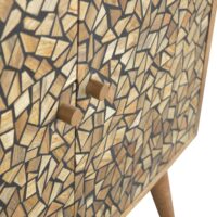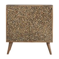 This cabinet has been constructed from 100% solid mango and features a unique design made from little resin pieces to create a dimensional look. It has Nordic-style legs and round shiny knobs.
