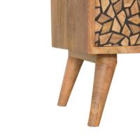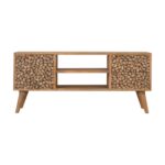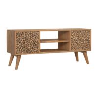 This media unit has been constructed from 100% solid mango wood in a oak-ish finish. It has 2 drawers and 2 open slots for storage convenience and features nordic style legs with shiny brass knobs which give a lovely contrast against the print. More items available from the Lisbon range.