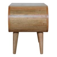 This round style media unit has been constructed from 100% solid mango wood in an oak-ish finish. It features 2 open slots and 2 drawers which provide great storage and will come in handy in the living room. Some other features include 4 Nordic style legs and shiny knobs on the drawers. It can be used alone or be partnered with the other rounded furniture pieces from the collection.