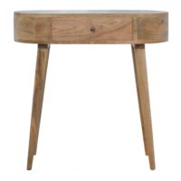 This solid wood console table has been constructed from 100% solid mango wood in an oak-ish finish and offers a unique shaped design with rounded edges. It features one small drawer with a shiny knob and Nordic style legs. A great, simple addition to the bedroom.