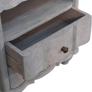Introducing the Lucia Bedside, where soft vintage charm meets solid craftsmanship. Handcrafted from 100% solid mango wood in a distinctive Acid Wash finish, this piece evokes a serene, lived-in elegance. The gently curved drawer fronts, adorned with antique brass knobs, offer a graceful rhythm to the design, while the rounded legs and open shelf add both character and practicality. Ideal for adding a touch of heritage to any bedroom, the Lucia Bedside is a timeless accent for classic and contemporary interiors alike.