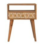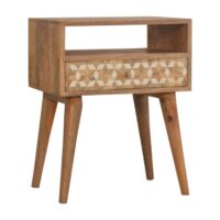 A perfect addition to the bedroom this bedside has been constructed from 100% solid mango wood. It features an open slot and a White Resin Inlay drawer, ideal for keeping things nearby. Some other features include Nordic-style legs, a patterned drawer, and 1 shiny knob.