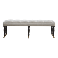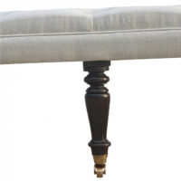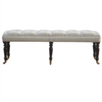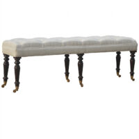 This long hallway bench is constructed from 100% solid mango wood and the seat is upholstered white lily cotton. Other features include a deep buttoned upholstered seat and hand turned castor legs which have a light walnut finish. A beautiful and practical piece of furniture for your home.